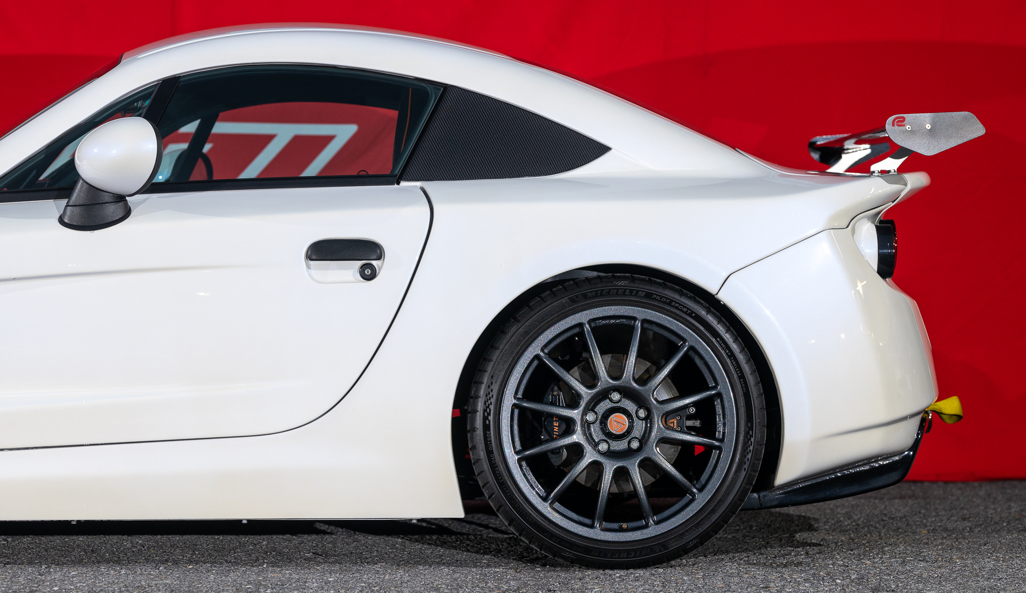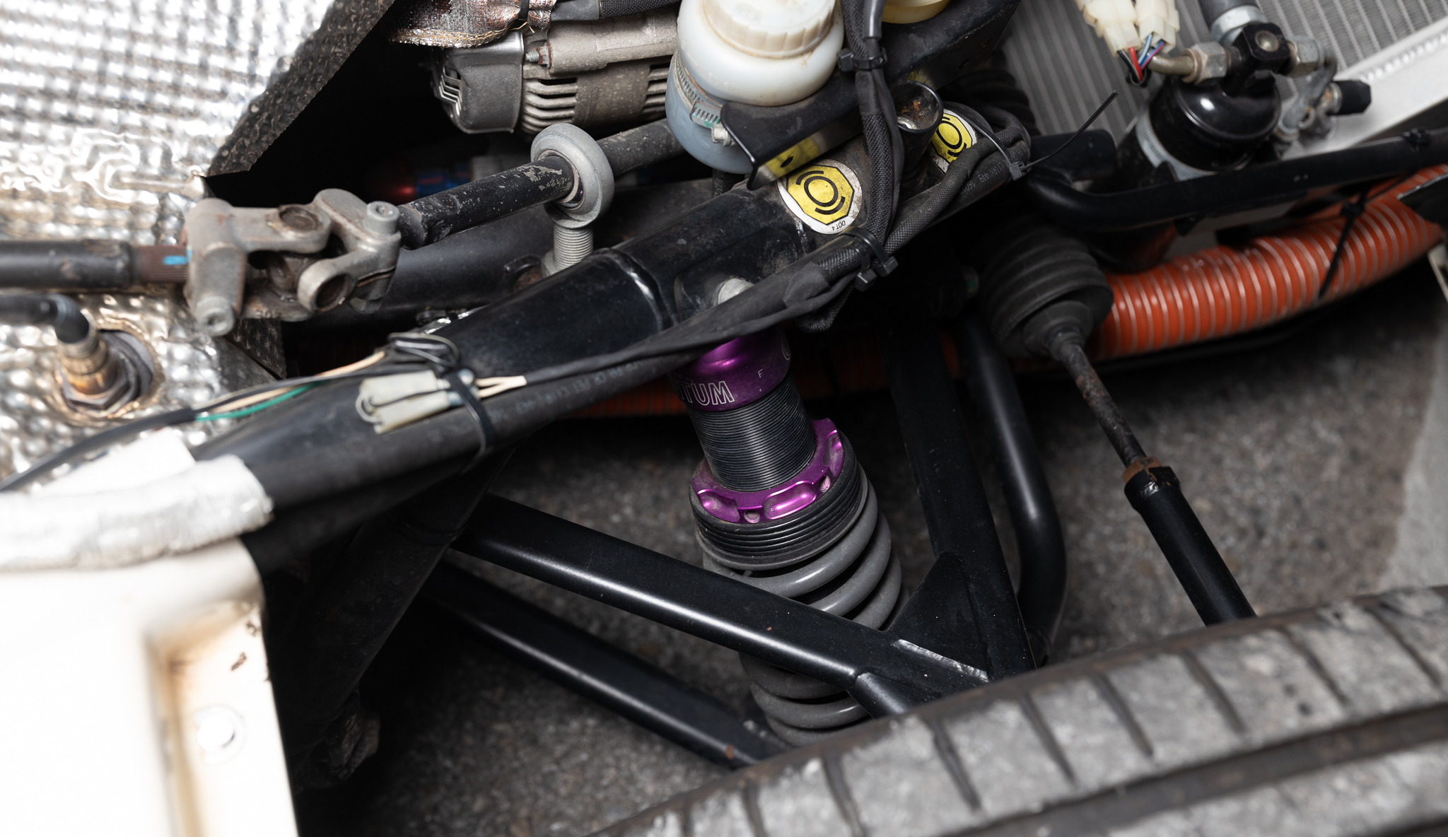 クワンタム製車高調整式アブソーバーで、前後バランスを。キャンバーシムでアライメント調整も可能な作り。リセッティングのご相談もお待ちしております。