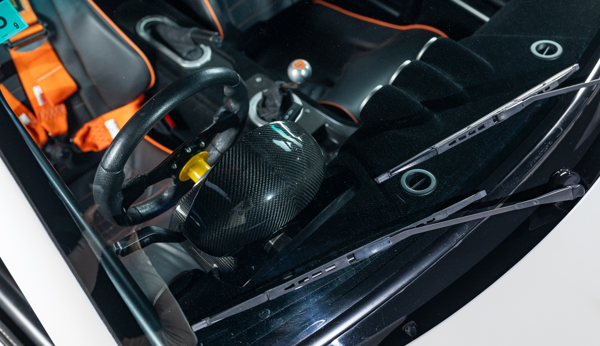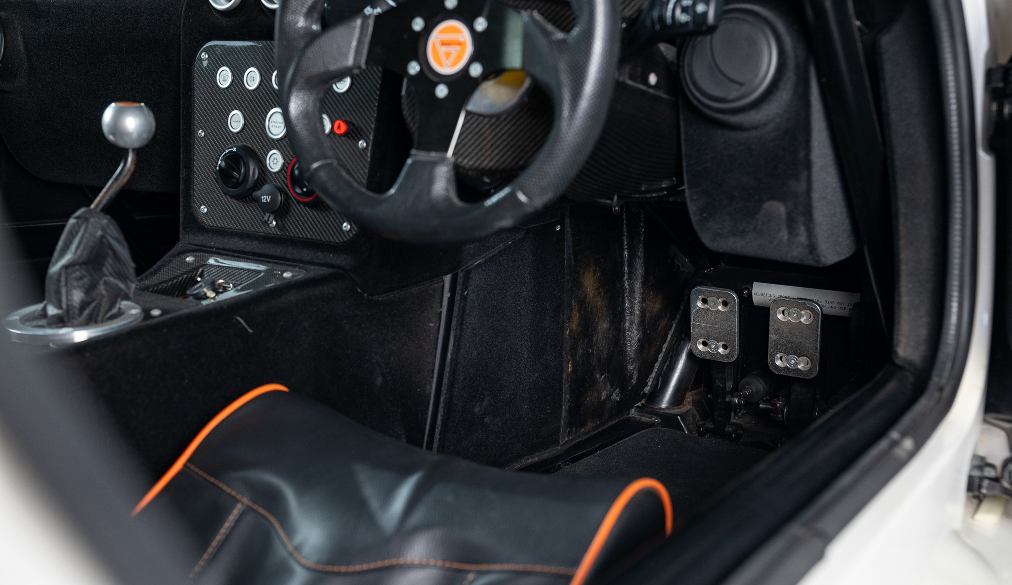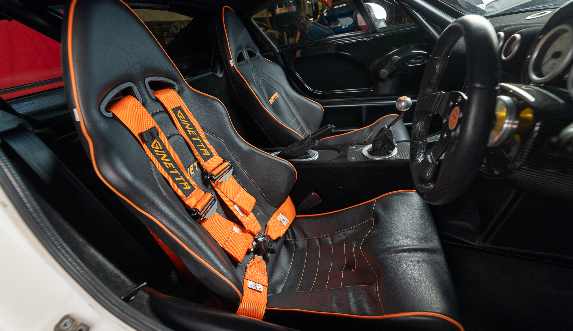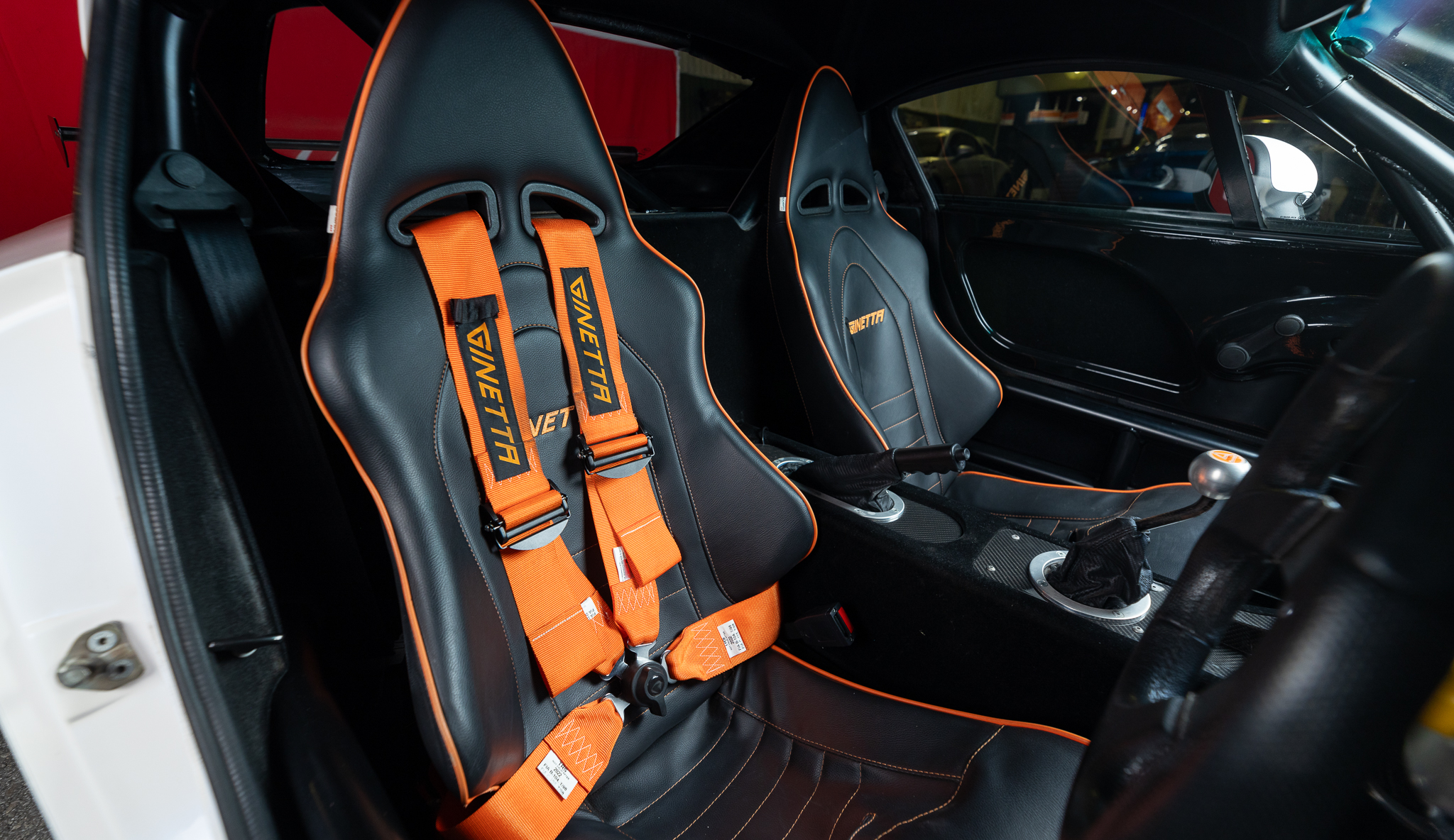 FIA規格のフルケージはAピラーの視界を遮ることなく、非常に綺麗にインテリアの一部となっています。スライド式シートが左右ともに採用されています。