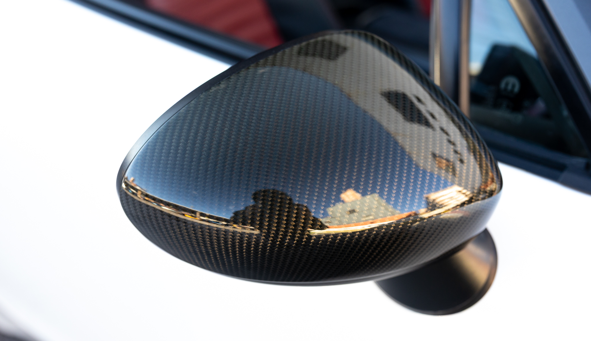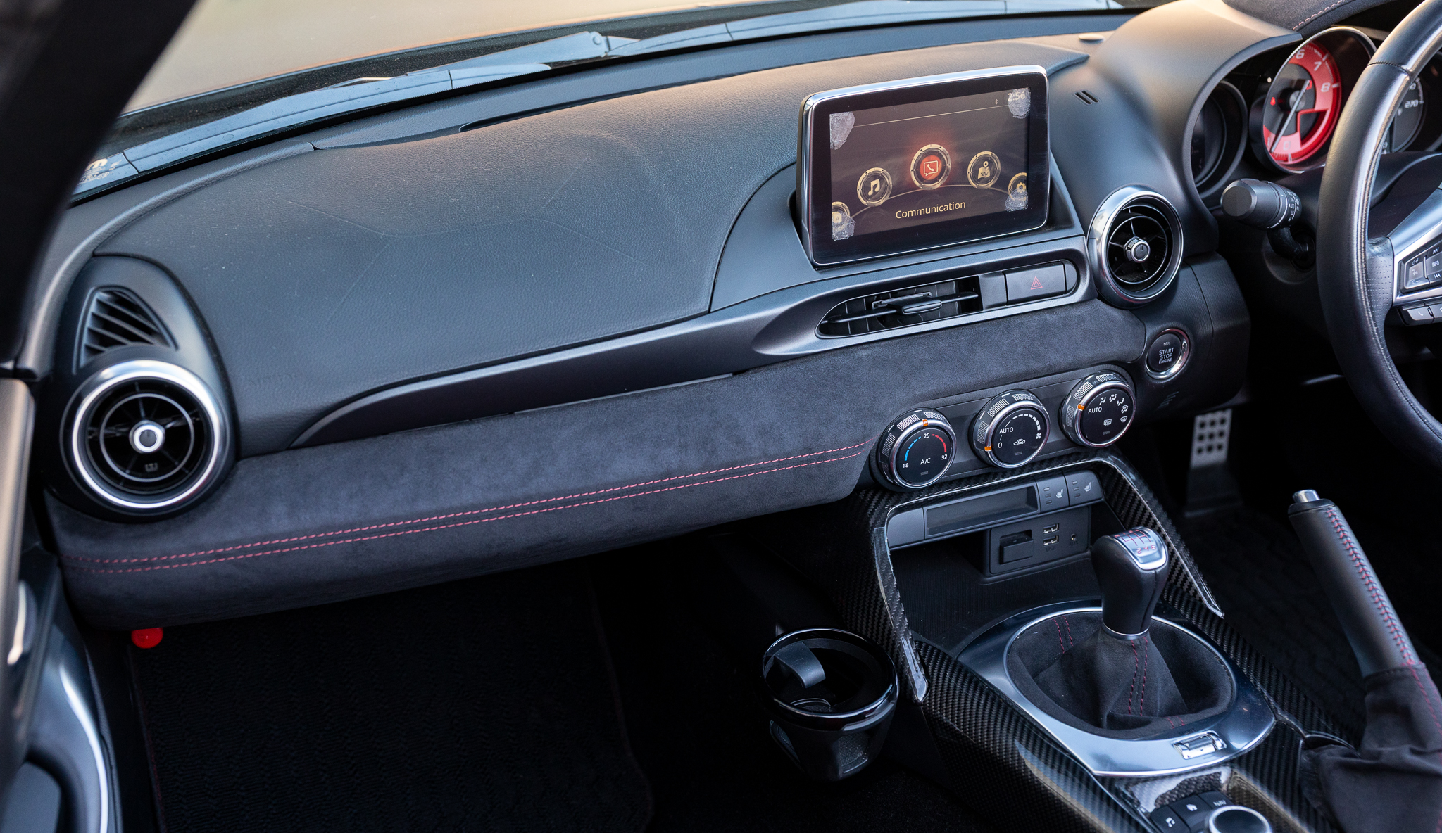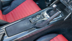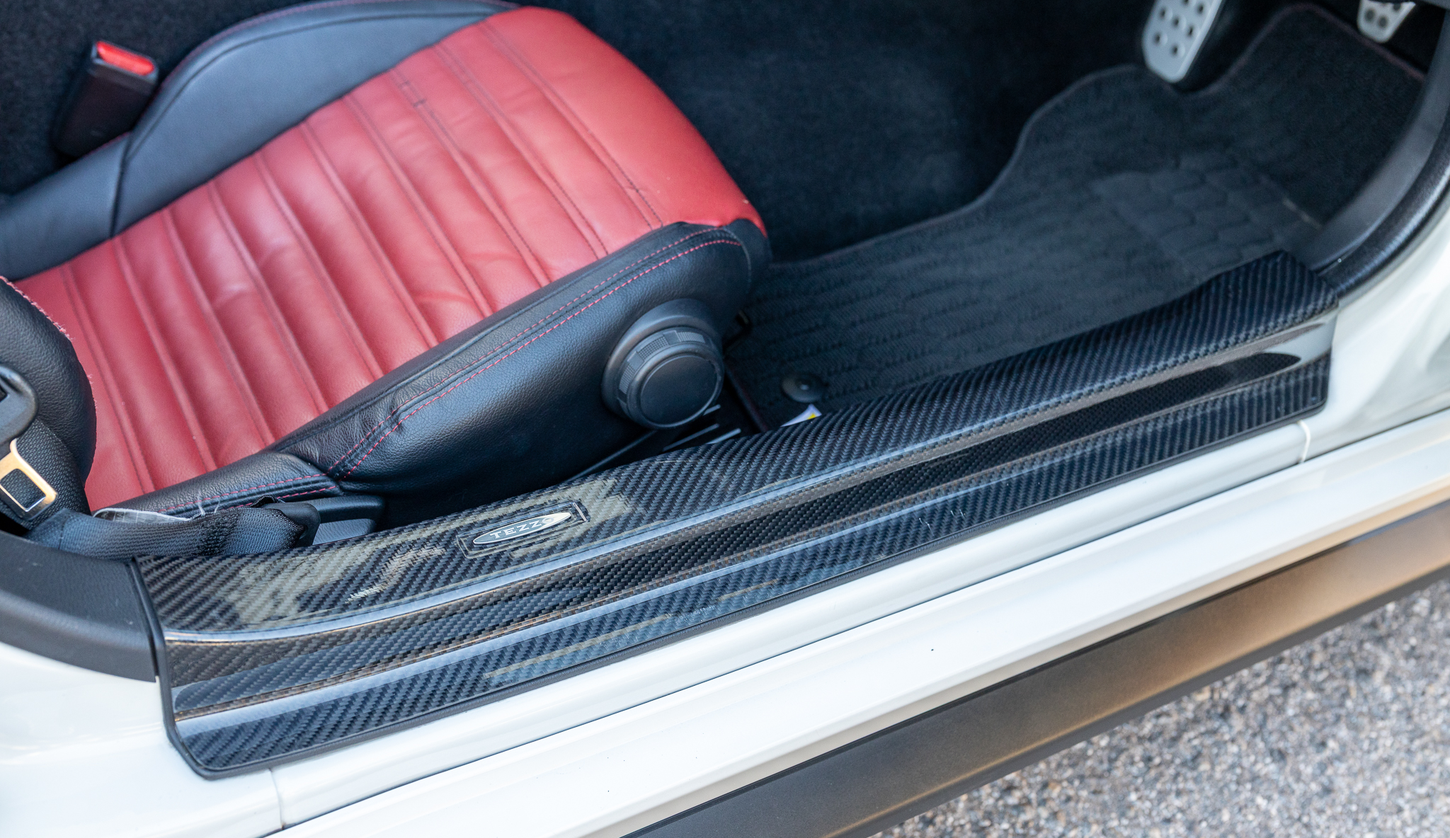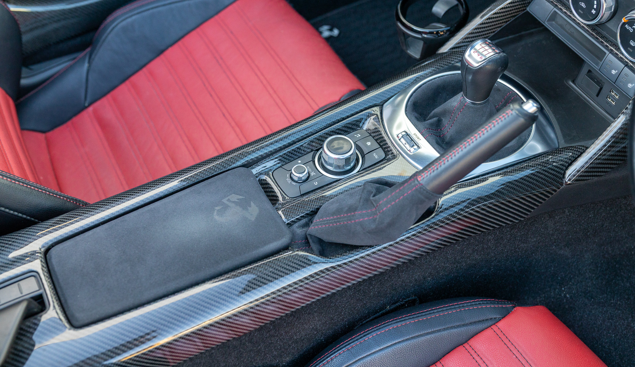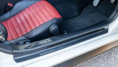 バックモニター及びコーナーセンサーを装備しています。シフトトリムやエアコン操作部にレッドカーボンに交換されています。